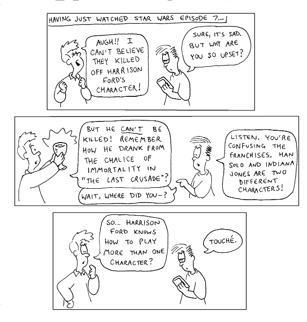 NO DISRESPECT is intended towards Harrison Ford in this cartoon, an actor whose movies I have enjoyed my whole life. Rather, this cartoon is a commentary on the sad fact that certain actors seem to get typecast into certain types of roles. It is quite possible that, given the right script, Harrison Ford could easily portray a warm, loving father figure with deep sensitivities. But as far as I know, he's never had that chance. Every role of his of which I am acquainted casts him as the gruff, solitary, adventuring type. On the other hand, I suppose being typecast as the tough guy is not necessarily a bad legacy: a generation earlier, did not Humphrey Bogart achieve fame for doing pretty much the same thing?