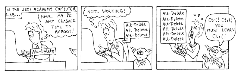 The pun in the above drawing, of course, stems from the Ctrl-Alt-Delete command used to reboot MS-DOS and Windows computers.