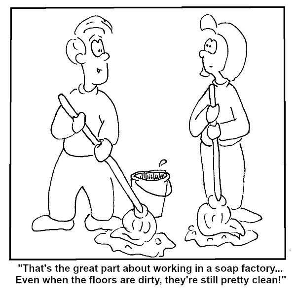 It all started in 1998 when I was working at Cateraid for the summer. Cateraid is the best-managed company I ever worked for. Everyone chipped in to help; no chore was beneath anyone. We all took turns washing dishes and mopping floors, in addition to baking cookies and decorating cakes. One day, while I was mopping cake batter off the floor, the thought came to me: "What if I there was soap on the floor, instead of cake batter? The floors would be so clean! What if I worked at a soap factory instead of a bakery?" And this drawing was born.
