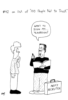 This drawing treats two common themes in the life of high school seniors: signing lots of yearbooks, and dodging army recruiters. During my senior year, I got repeated phone calls and postcards from the army, trying to convince me to sign up. They never got very far with me, though...