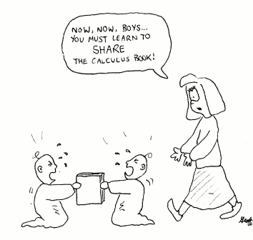 In this one, the sarcasm is ever so subtle. Since I felt so little attachment to my calculus book (I who knew the value of its contents), I thought it would be ironic to depict babies having a strong attachment to it (they who know nothing of its contents). Get it?! No? That's okay. It wasn't that funny to start with. |