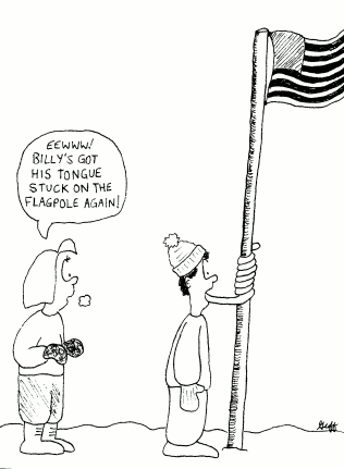 ![]() | This cartoon is inspired by a memorable scene in that classic film, A Christmas Story. In the film, a little boy is goaded by his classmates to touch his tongue to a flagpole on a winter's day. In my typical warped manner, I decided to carry that concept to an irrational extreme. And hence, this cartoon was born. |