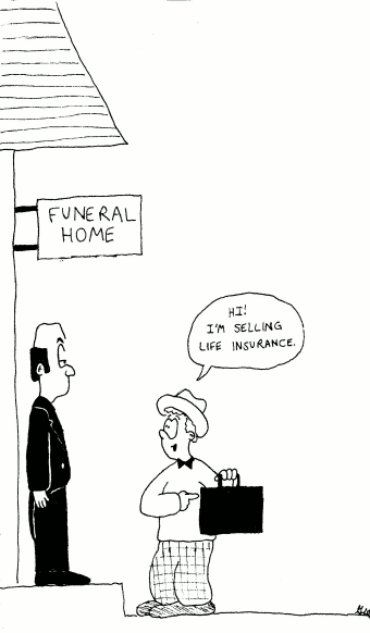 If I recall correctly, this cartoon was inspired by the expression: That makes about as much sense as selling life insurance at a funeral home. Similar phrases include: