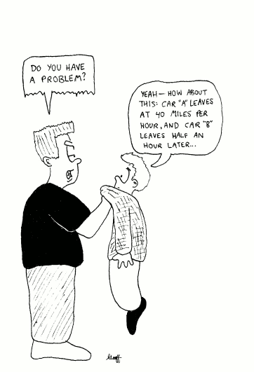 This story problem is typical of those I encountered in middle-school and high-school-level algebra courses. The premise is extendable, though. Substitute in a different kind of problem, and this cartoon could apply to almost any field of study.
