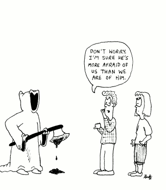In many ways, this cartoon is a tribute to a much funnier Far Side comic by Gary Larson. In that one, a guy finds a maraca player at the base of his sleeping bag, and his friend reassures him that maraca players are more scared of him than he is of them. A note on fashion: Notice the knee-length jeans with folded cuffs that the girl character is wearing. That is clear evidence that this cartoon was drawn in the early 1990's. I wonder if that style will ever come back in vogue? |