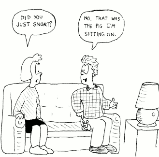 Once at a social gathering, a friend of mine was telling a joke, and laughed so hard at his own joke that he snorted. A nearby girl asked him, "Did you just snort?" My friend, ever quick-witted, came back with this clever but confusing reply: "No, that's just the pig I'm sitting on.".