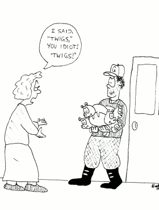 Perhaps the least successful spin on this theme was where the husband opens up a door with flames and blood-curdling screams coming out, and the wife says, "I said 'Open the BROOM closet, not the DOOM closet!'". That particular cartoon did not make it into my online collection. Now that there is actually a video game called DOOM, perhaps that one might be worth re-drawing. |