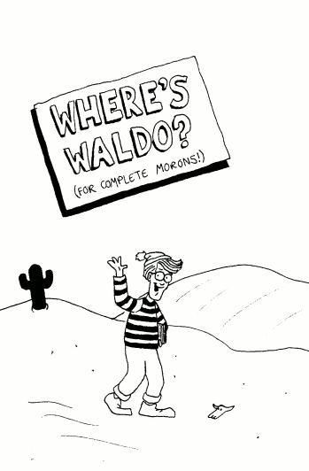 This cartoon was drawn at the height of Waldo's fame, when it seemed like a new Waldo book was being introduced every few months. I thought it would be funny to make an easy Waldo book for people who have trouble finding him. After that idea took hold, the cartoon followed suit. Incidentally, I still haven't written that Tetris for Morons video game that I thought of around the same time. It would be like regular Tetris, except that every piece would be thin and straight. If any of you want to implement it for me, I'll gladly add a link from my site to yours. |