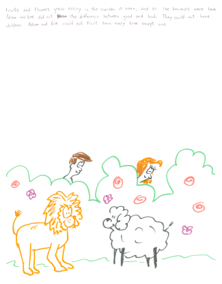 Fruits and flowers grew easily in the Garden of Eden, and all the animals were tame. Adam and Eve did not know the difference between good and bad. They could not have children.