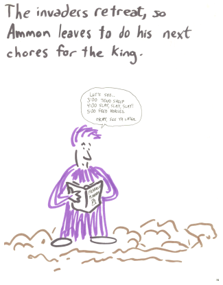 The invaders retreat, so Ammon leaves to do his next chores fro the king.