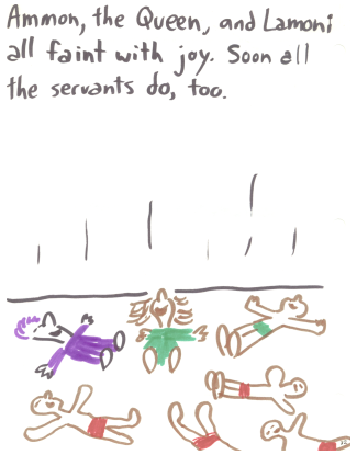 Ammon, the Queen, and Lamoni all faint with joy. Soon all the servants do, too.