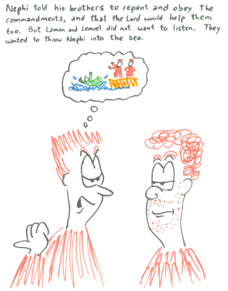 Nephi told his brothers to repent and obey the commandments, and that the Lord would help them too. But Laman and Lemuel did not want to listen. They wanted to throw Nephi into the sea.