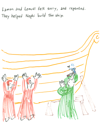 Laman and Lemuel felt sorry, and repented. They helped Nephi build the ship.
