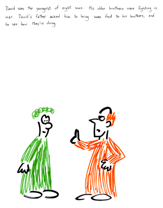David was the youngest of eight sons. His older brothers were fighting in the war. David's father asked him to bring some food to his brothers, and to see how they're doing.