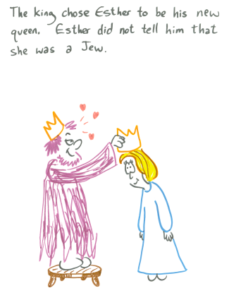 The king chose Esther to be his new queen. Esther did not tell him that she was a Jew.