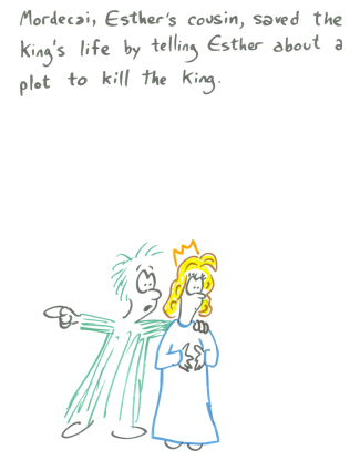 Mordecai, Esther's cousin, saved the king's life by telling Esther about a plot to kill the king.