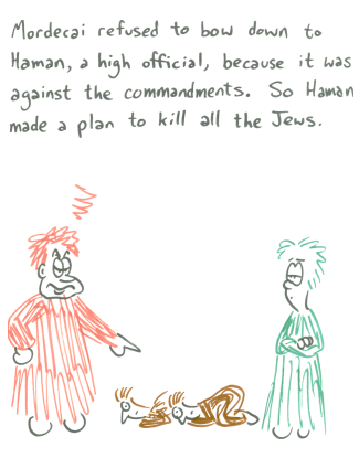 Mordecai refused to bow down to Haman, a high official, because it was against the commandments. So Haman made a plan to kill all the Jews.