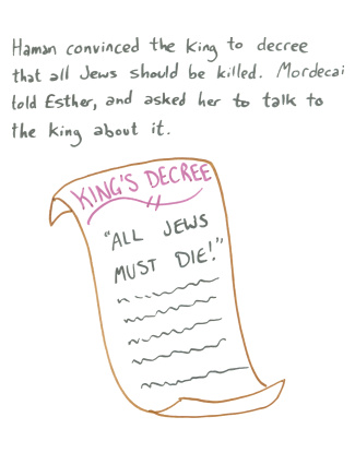 Haman convinced the king to decree that all Jews should be killed. Mordecai told Esther, and told her to talk to the king about it.