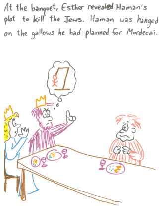 At the banquet, Esther revealed Haman's plot to kill the Jews. Haman was hanged on the gallows he had planned for Mordecai.