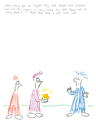 When they got back to Egypt, they told Joseph that someone had put the money in their sacks. He told them not to worry about it, it must have been a gift from God.