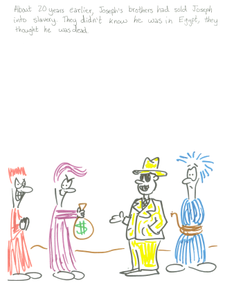 About 20 years earlier, Joseph's brothers had sold Joseph into slavery. They didn't know he was in Egypt, they thought he was dead.