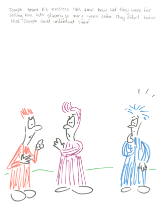 Joseph heard his brothers talk about how sad they were for selling him into slavery so many years before. They didn't know that Joseph could understand them.