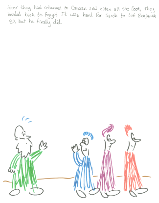 After they had returned to Canaan and eaten all the food, they headed back to Egypt. It was hard for Jacob to let Benjamin go, but he finally did.