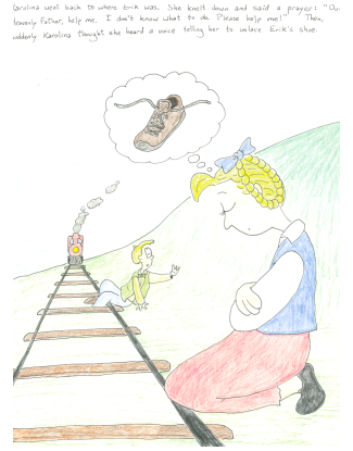 Karolina went back to where Erik was. She knelt down and said a prayer: "Our Heavenly Father, help me. I don't know what to do. Please help me!" Then, suddenly Karolina thought she heard a voice telling her to unlace Erik's shoe.