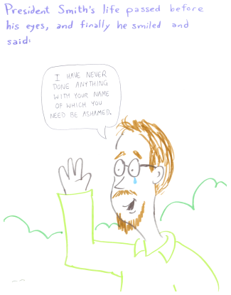 President Smith's life passed before his eyes, and finally he smiled and said: "I have never done anything with your name of which you need be ashamed."