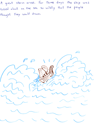A great storm arose. For three days the ship was tossed about on the sea so wildly that the people thought they would drown.