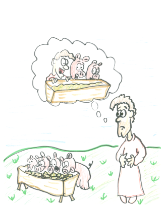 Starving, he got a job feeding pigs. He was so hungry, he wanted to eat the pigs' food!