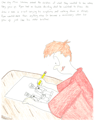 had no trouble deciding what he wanted to draw. He drew a man in a suit carrying his scriptures