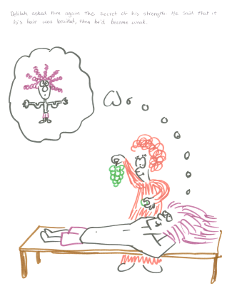 Delilah asked him again the secret of this strength. He said that if his hair was braided, then he'd become weak.