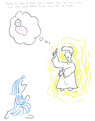 During this time, an angel told a women that she would have a son who would deliver Israel from the Philistines.