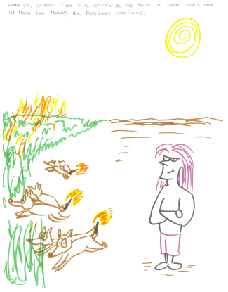 Later on, Samson tied fire sticks to the tails of some foxes and let them run through the Philistines' cornfields.