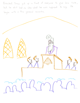 President Snow got up in front of everyone to give his talk, but he still had no idea what he was supposed to say. He began with a few general remarks.